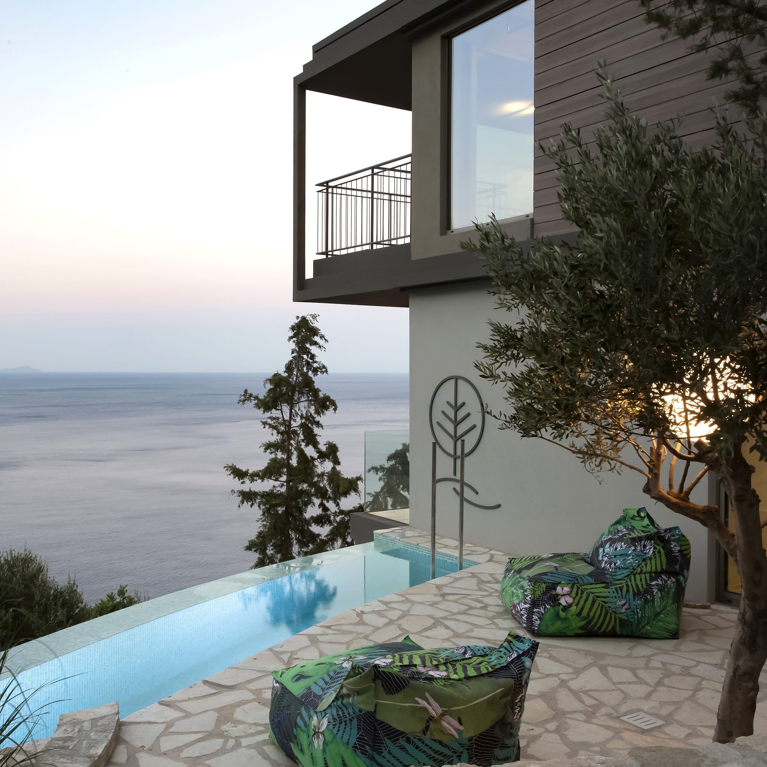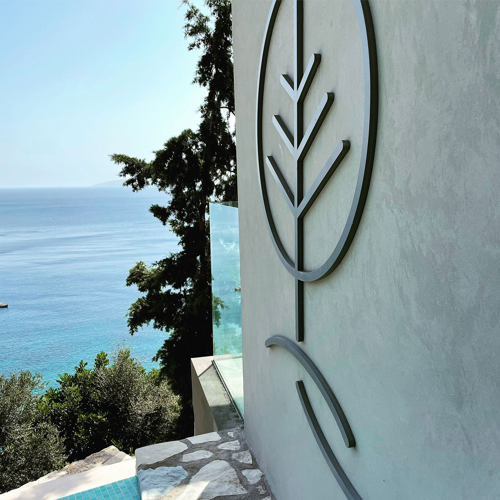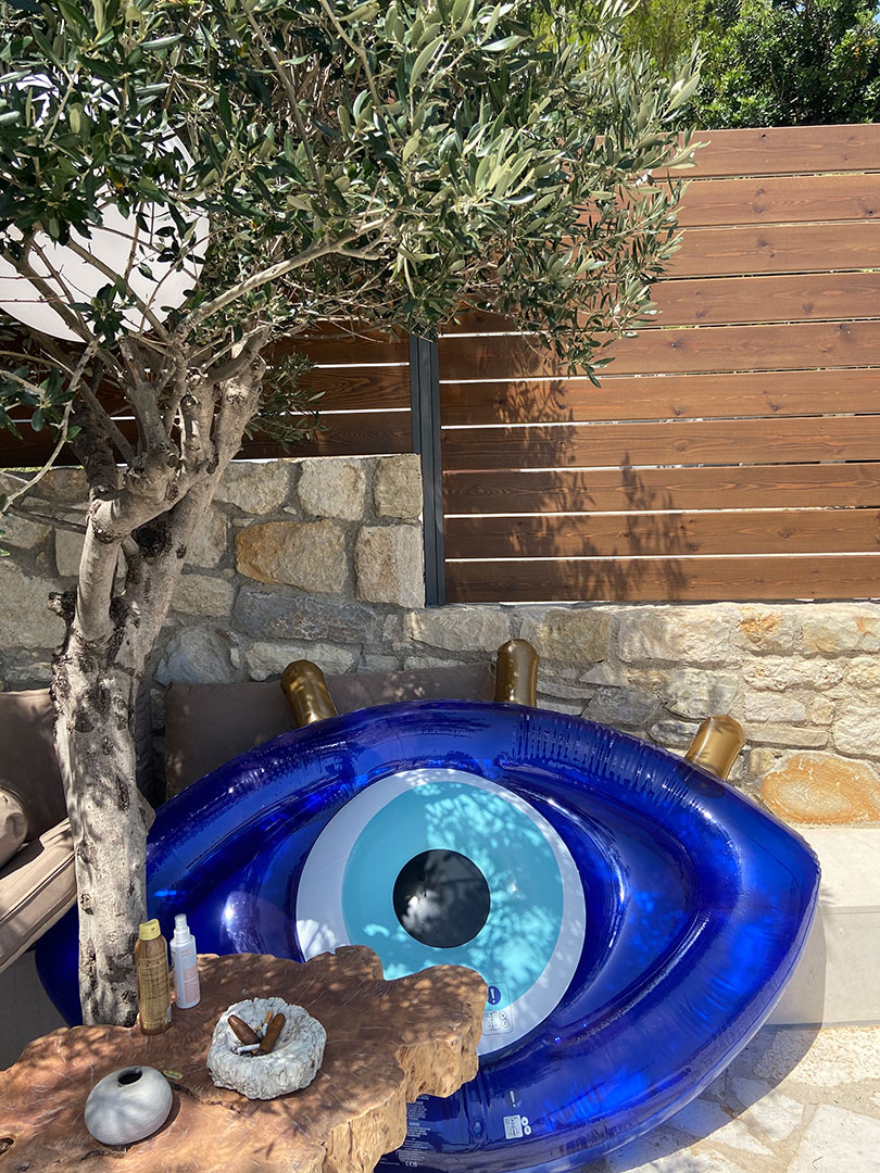 The garden at the bedrooms level features a further relaxation area with a small infinity pool alongside a dining little space positioned around an olive tree inspired by the concept of the “platia”; a village square typical of life in Greece depicting a sense of community and gathering whilst enjoying a Greek coffee or a sip of Raki whilst relishing the taste of home-grown olives and local delicacies.